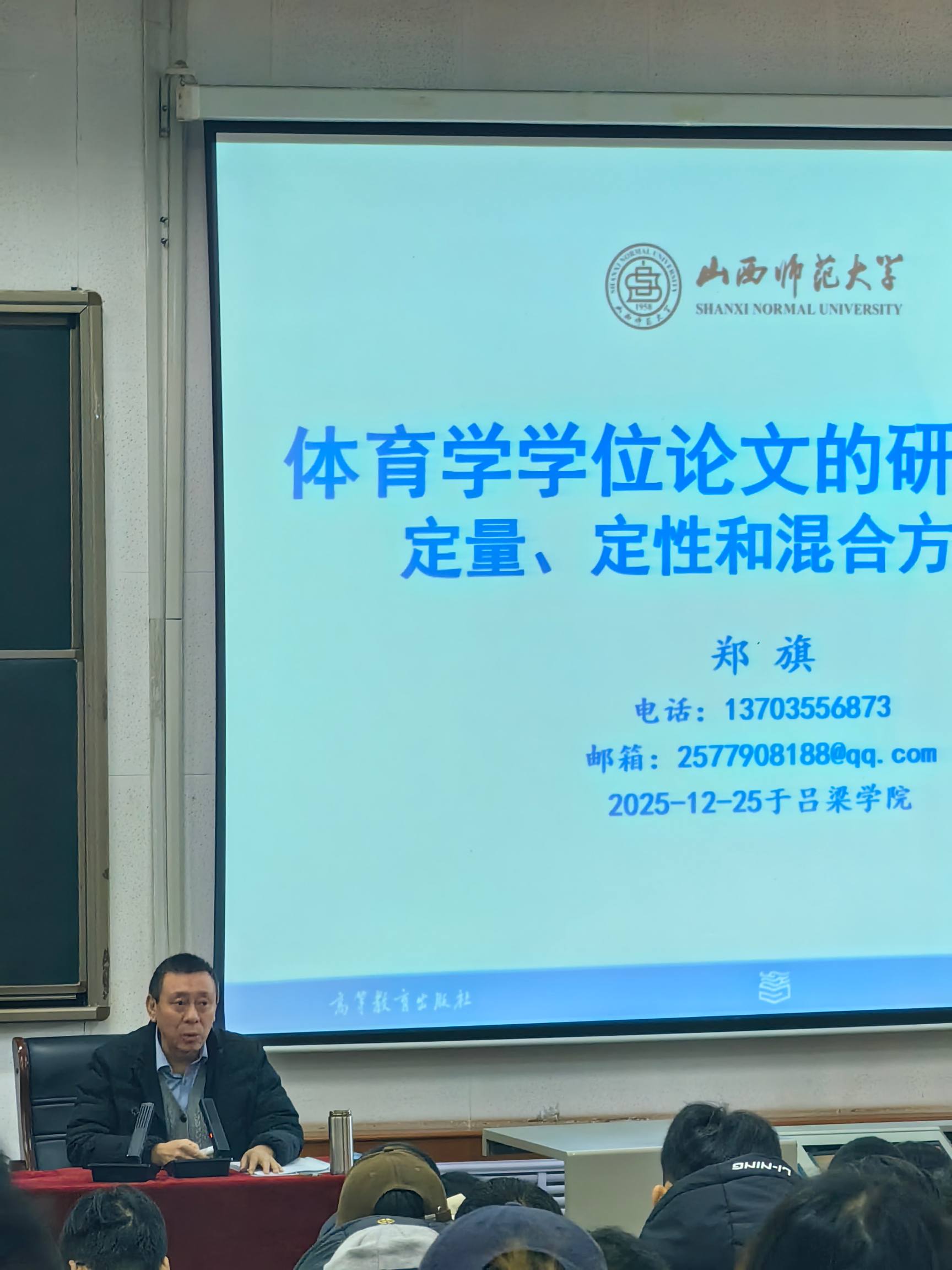 2025年12月25日上午10时至12时,体育与健康系在弘毅楼1C-201教室成功举办学术讲座,特邀郑旗教授以“体育学学位论文的研究范式:定量、定性和混合方法研究”为主题分享真知灼见。系全体教师及大四学生齐聚现场,共同聆听这场学术盛宴,讲座由系主任赵永军主持。